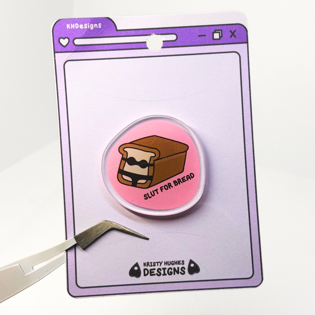This funny bread themed acrylic pin depicts the funny words ‘Sl*t For Bread’ with a loaf of bread in a black bikini, bringing a taste of humour and everything bread-y vibes to your everyday life, and your boring jackets and bags!<33